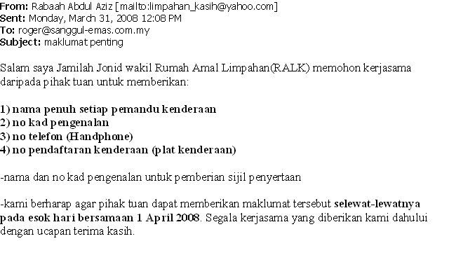 DEAR MEMBERS, THANK YOU FOR PARTICIPATE, FOR LAST MINUTE REGISTRATION, PLEASE SMS ME DIRECTLY AT 017 8793243 WITH YOUR FULL NAME, IC, TEL AND CAR REGISTRATION NUMBER BEFORE 6 PM TMMR. THANK YOU AGAIN.