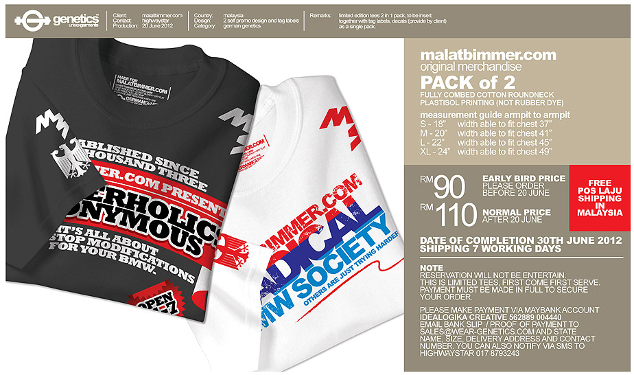 malatbimmer limited edition tees has been sent for production. The supplier said will try to rush before 7th July. Hope can be ready before the date :). Thank you to those who purchase the goods as an early bird :), the T-shirt now still available to purchase at RM110 per set with free goodies and shipping. Thank you again